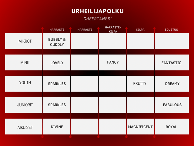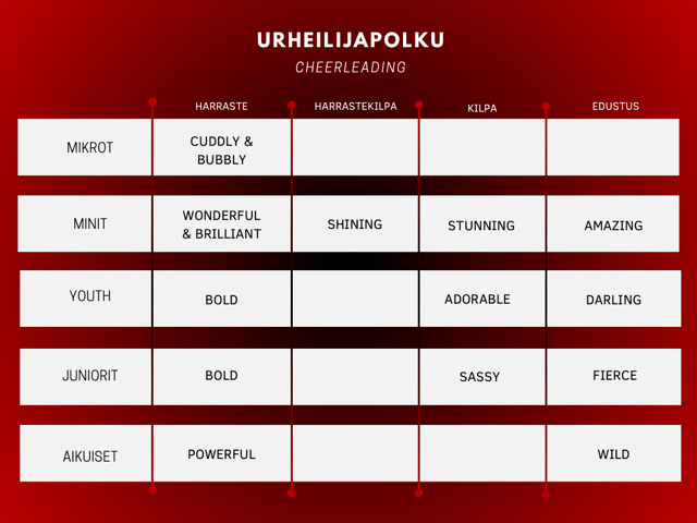 Kilpaileviin joukkueisiin haetaan kerran vuodessa järjestettävissä joukkuevalintatilaisuuksissa. Tarkistathan ennen ilmoittautumista joukkueen ikärajat. Tarvittaessa ota yhteyttä joukkueen valmentajiin, jos sinulla on kysyttävää joukkueesta tai lajista. Tutustu jäsenoppaaseen, se sisältää tarkempaa tietoa maksuista ja seuratoiminnasta