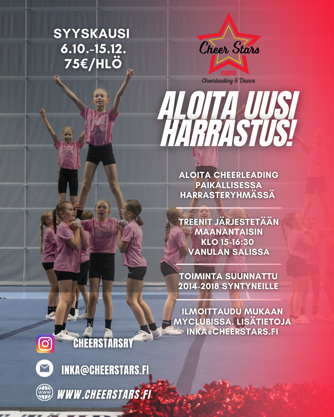 Lisätietoa kurssin toiminnasta saat sähköpostilla inka@cheerstars.fi.
