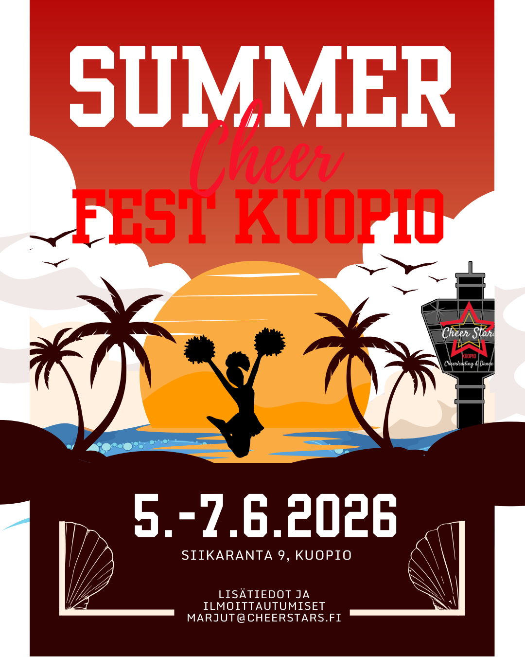 Kesäleiri Summer cheer Fest Kuopio kokoaa lajin harrastaja ympäri Suomea Kuopion Siikarantaan 5.-7.6.2026. Lisätietoja marjut@cheerstars.fi
