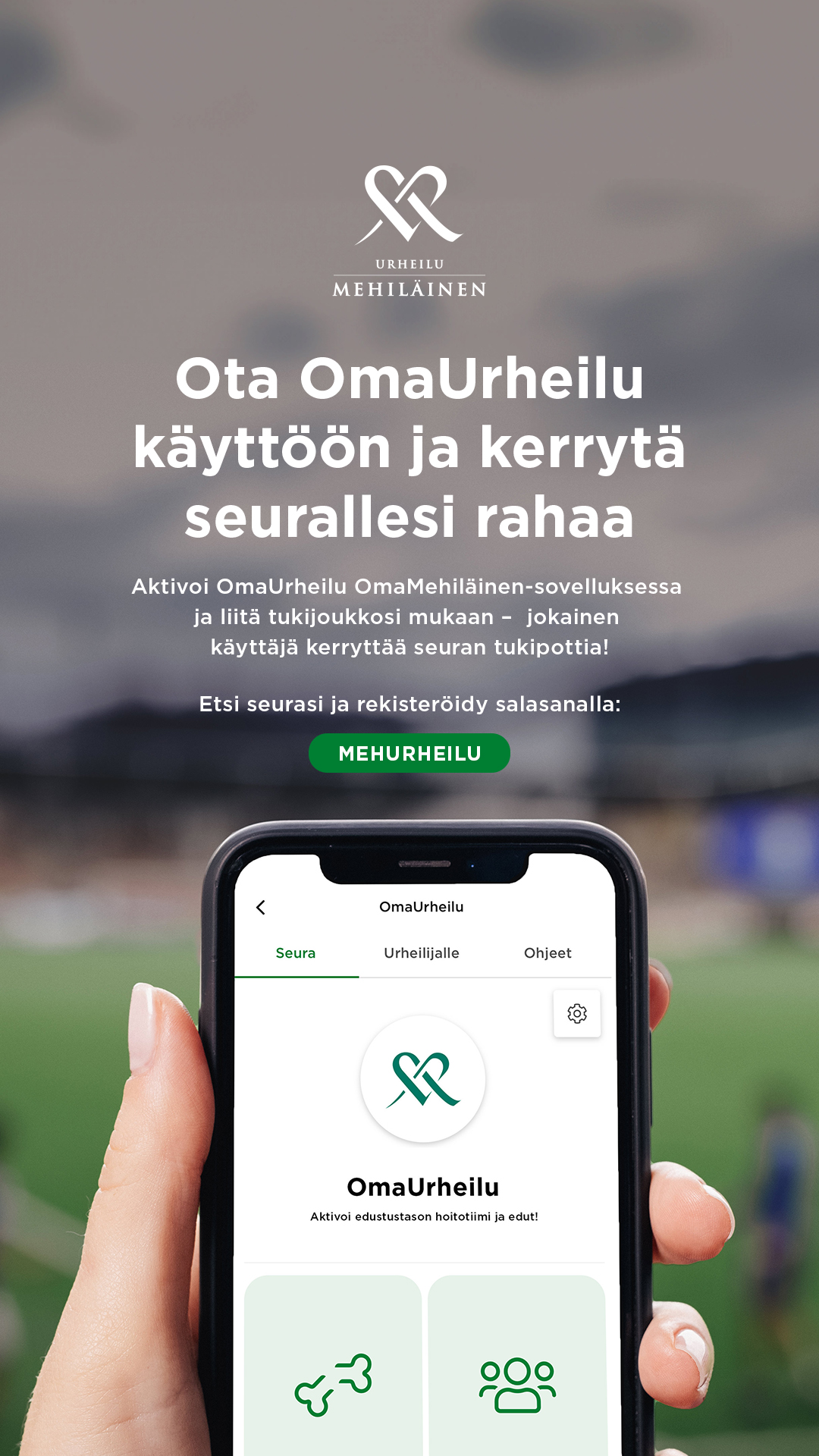 Lataa OmaMehiläinen-sovellus älypuhelimeesi tai kirjaudu verkkopalveluun, niin pääset rekisteröitymään OmaUrheiluun. Rekisteröitymällä OmaUrheilu -palveluun ja asioimalla Mehiläisessä kerrytät seuralle maksettavaa tukipottia. Myös seuran kannattajiksi rekisteröityneiden perheenjäsenten ja muun lähipiirin asiointi Mehiläisessä kasvattaa seuran tukipottia. Sovelluksen lataaminen ja kirjautuminen on maksutonta.